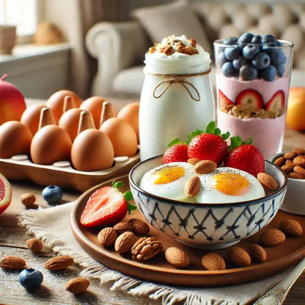 Desayuno rico en proteínas con huevos y yogurUn desayuno con proteína mejora la energía diaria.